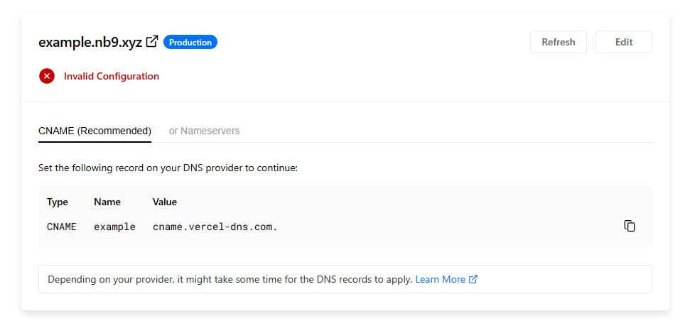 此时会提示配置错误,需要在你的域名服务商那里进行DNS配置。
